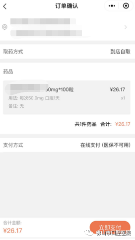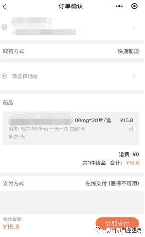 步骤 6:点击电子处方,支付药品订单,可选择由定点合作药房邮寄药品到家,或到店自取。